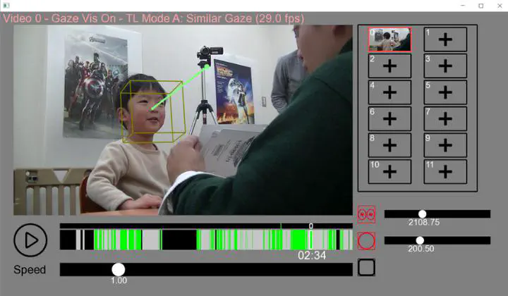 This paper presents a novel interface to support video coding of social attention in the assessment of children with autism spectrum disorder. Video-based evaluations of social attention during therapeutic activities allow observers to find target behaviors while handling the ambiguity of attention. Despite the recent advances in computer vision-based gaze estimation methods, fully automatic recognition of social attention under diverse environments is still challenging. The goal of this work is to investigate an approach that uses automatic video analysis in a supportive manner for guiding human judgment. The proposed interface displays visualization of gaze estimation results on videos and provides GUI support to allow users to facilitate agreement between observers by defining social attention labels on the video timeline. Through user studies and expert reviews, we show how the interface helps observers perform video coding of social attention and how human judgment compensates for technical limitations of the automatic gaze analysis.