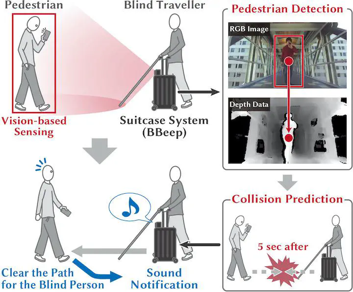 We present an assistive suitcase system, BBeep, for supporting blind people when walking through crowded environments. BBeep uses pre-emptive sound notifications to help clear a path by alerting both the user and nearby pedestrians about the potential risk of collision. BBeep triggers notifications by tracking pedestrians, predicting their future position in real-time, and provides sound notifications only when it anticipates a future collision. We investigate how different types and timings of sound affect nearby pedestrian behavior. In our experiments, we found that sound emission timing has a significant impact on nearby pedestrian trajectories when compared to different sound types. Based on these findings, we performed a real-world user study at an international airport, where blind participants navigated with the suitcase in crowded areas. We observed that the proposed system significantly reduces the number of imminent collisions.