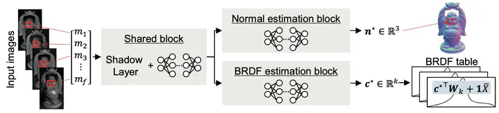 This paper presents a photometric stereo method based on deep learning. One of the major difficulties in photometric stereo is designing an appropriate reflectance model that is both capable of representing real-world reflectances and computationally tractable for deriving surface normal. Unlike previous photometric stereo methods that rely on a simplified parametric image formation model, such as the Lambert’s model, the proposed method aims at establishing a flexible mapping between complex reflectance observations and surface normal using a deep neural network. In addition, the proposed method predicts the reflectance, which allows us to understand surface materials and to render the scene under arbitrary lighting conditions. As a result, we propose a deep photometric stereo network (DPSN) that takes reflectance observations under varying light directions and infers the surface normal and reflectance in a per-pixel manner. To make the DPSN applicable to real-world scenes, a dataset of measured BRDFs (MERL BRDF dataset) has been used for training the network. Evaluation using simulation and real-world scenes shows the effectiveness of the proposed approach in estimating both surface normal and reflectances.