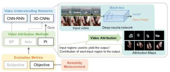 The attribution method provides a direction for interpreting opaque neural networks in a visual way by identifying and visualizing the input regions/pixels that dominate the output of a network. Regarding the attribution method for visually explaining video understanding networks, it is challenging because of the unique spatiotemporal dependencies existing in video inputs and the special 3D convolutional or recurrent structures of video understanding networks. However, most existing attribution methods focus on explaining networks taking a single image as input and a few works specifically devised for video attribution come short of dealing with diversified structures of video understanding networks. In this paper, we investigate a generic perturbation-based attribution method that is compatible with diversified video understanding networks. Besides, we propose a novel regularization term to enhance the method by constraining the smoothness of its attribution results in both spatial and temporal dimensions. In order to assess the effectiveness of different video attribution methods without relying on manual judgement, we introduce reliable objective metrics which are checked by a newly proposed reliability measurement. We verified the effectiveness of our method by both subjective and objective evaluation and comparison with multiple significant attribution methods.