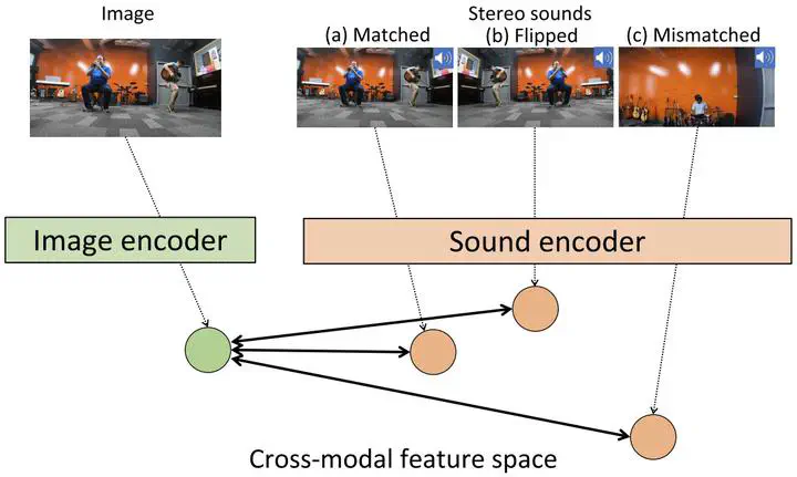 Learning cross-modal features is an essential task for many multimedia applications such as sound localization, audio-visual alignment, and image/audio retrieval. Most existing methods mainly focus on the semantic correspondence between videos and monaural sounds, and spatial information of sound sources has not been considered. However, sound locations are critical for understanding the sound environment. To this end, it is necessary to acquire cross-modal features that reflect the semantic and spatial relationship between videos and sounds. A video with stereo sound, which has become commonly used, provides the direction of arrival of each sound source in addition to the category information. This indicates its potential to acquire a desired cross-modal feature space. In this paper, we propose a novel self-supervised approach to learn a cross-modal feature representation that captures both the category and location of each sound source using stereo sound as input. For a set of unlabeled videos, the proposed method generates three kinds of audio-visual pairs: 1) perfectly matched pairs from the same video, 2) pairs from the same video but with the flipped stereo sound, and 3) pairs from a different video. The cross-modal feature encoder of the proposed method is trained on triplet loss to reflect the relationship between these three pairs ( 1>2>3 ). We apply this method to cross-modal image/audio retrieval. Compared with previous audio-visual pretext tasks, the proposed method shows significant improvement in both real and synthetic datasets.