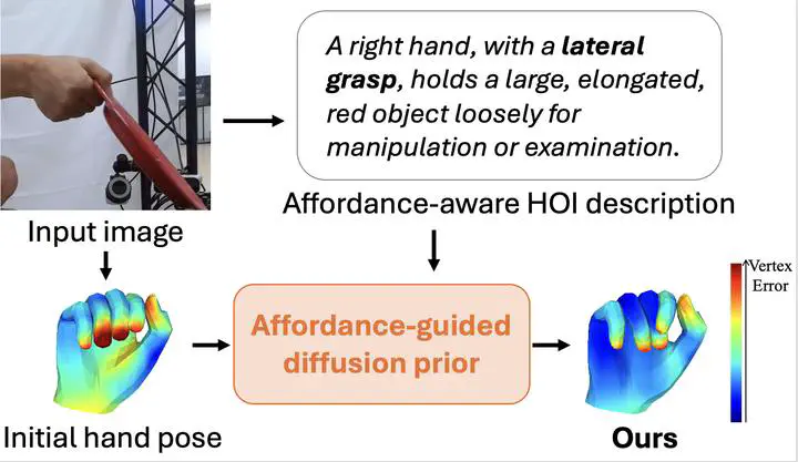 How can we reconstruct 3D hand poses when large portions of the hand are heavily occluded by itself or by objects? Humans often resolve such ambiguities by leveraging contextual knowledge – such as affordances, where an object’s shape and function suggest how the object is typically grasped. Inspired by this observation, we propose a generative prior for hand pose refinement guided by affordance-aware textual descriptions of hand-object interactions (HOI). Our method employs a diffusion-based generative model that learns the distribution of plausible hand poses conditioned on affordance descriptions, which are inferred from a large vision-language model (VLM). This enables the refinement of occluded regions into more accurate and functionally coherent hand poses. Extensive experiments on HOGraspNet, a 3D hand-affordance dataset with severe occlusions, demonstrate that our affordance-guided refinement significantly improves hand pose estimation over both recent regression methods and diffusion-based refinement lacking contextual reasoning.